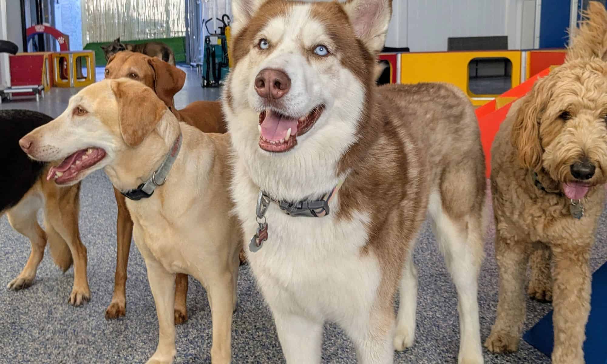 Dogs are matched in playgroups by size and personality so they feel right at home. From splashing in the pool to romping on play structures, chasing toys, enjoying one-on-one fun with our staff, or kicking back on cozy lounge chairs, every pup gets the perfect mix of play and relaxation.